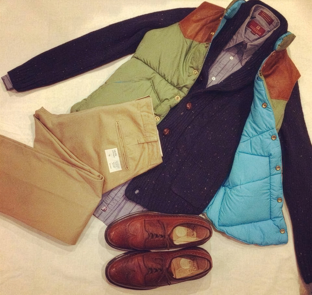 このベストの真価は、その汎用性の高さにある。 例えばBDシャツにドレッシーなタイを締め、その上にこの無骨なベストを重ねる。あるいは、肉厚なシェットランドセーターや、色落ちしたシャンブレーシャツとの組み合わせ。