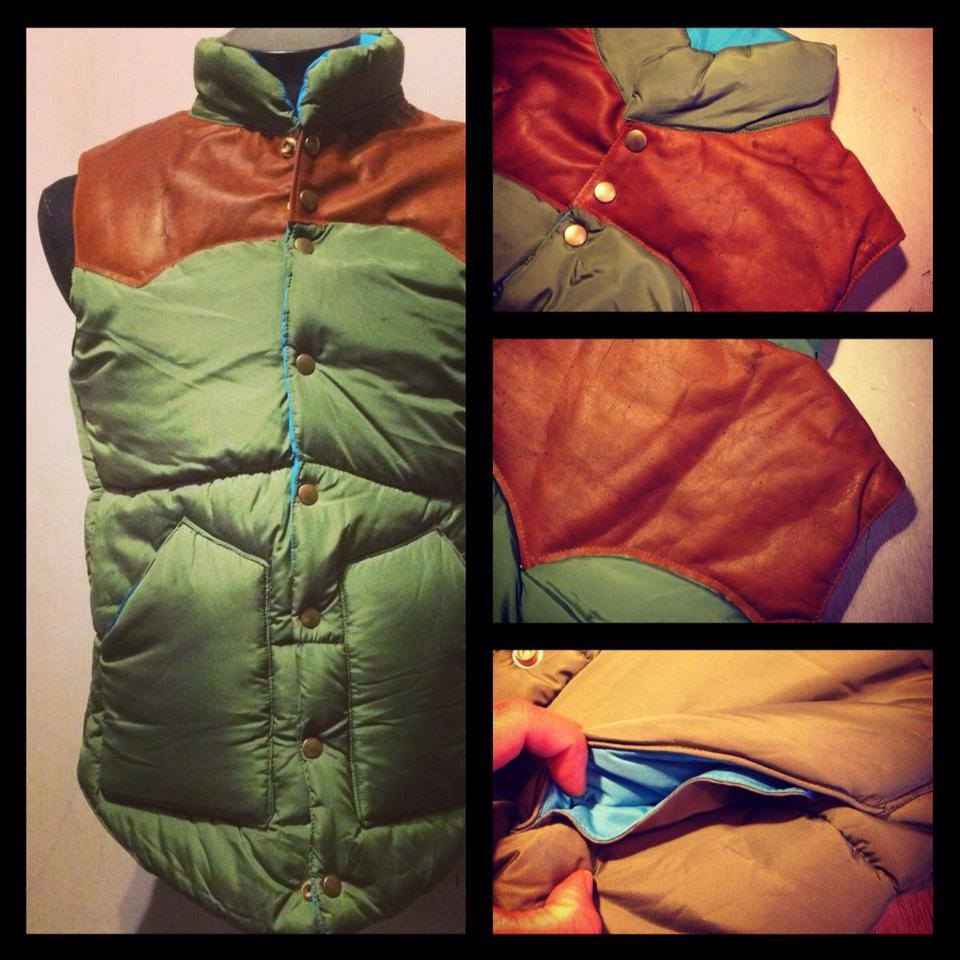 素材感、裏地も含めた配色、素材感、レザーの雰囲気、古着で出会える中でも最高クラスのダウンベストです。