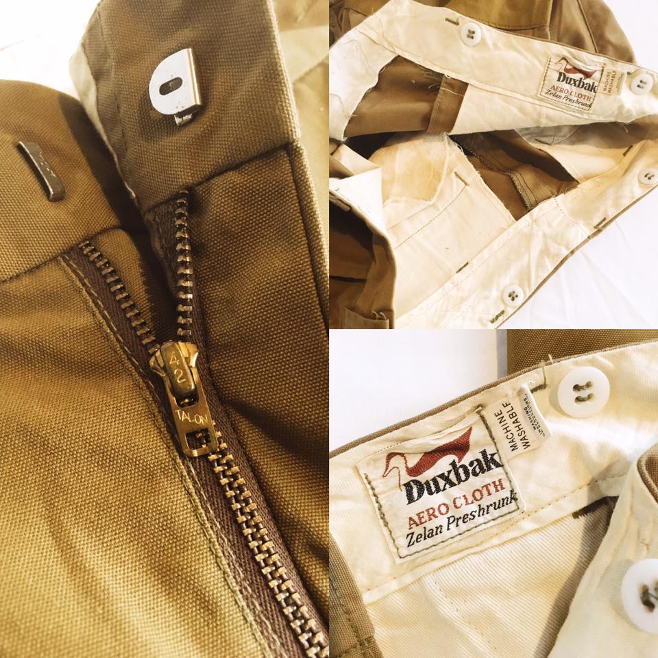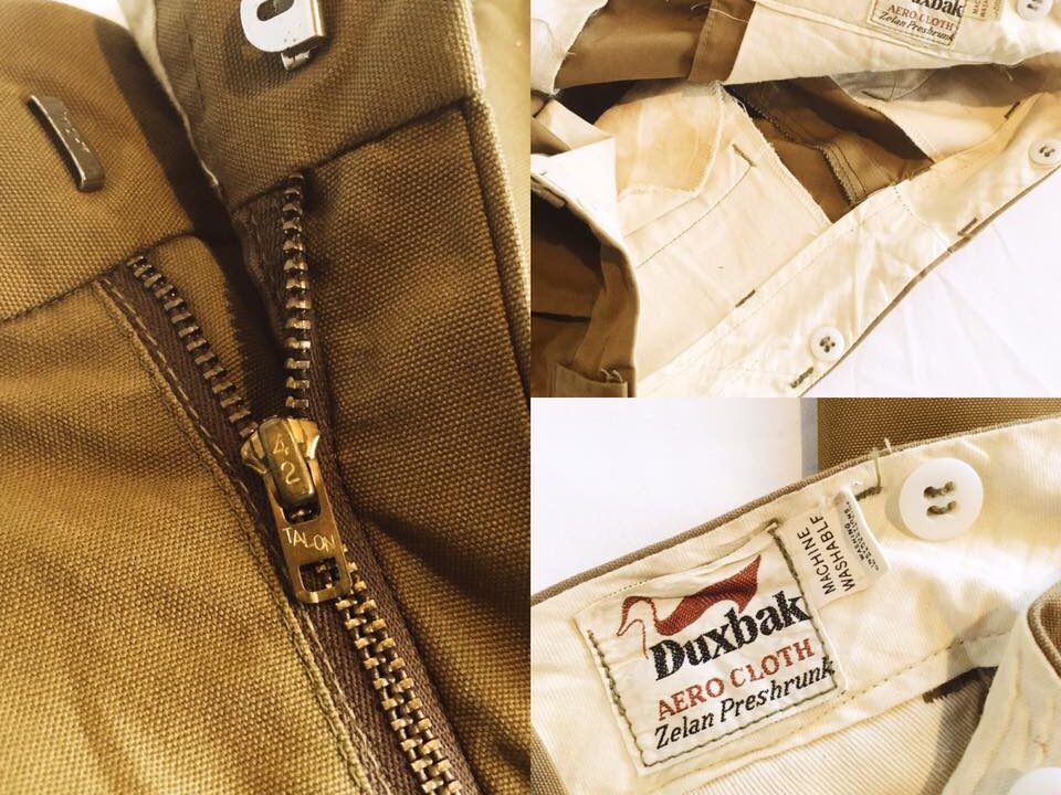 • 「AERO CLOTH」と「Zelan」表記: メインラベルに記された「AERO CLOTH(エアロクロス)」は、50年代〜60年代にDuxbakが主力とした、軽量かつ頑丈なコットン素材の名称です。また「Zelan」はデュポン社が開発した初期の撥水加工技術で、これがタグに入るのは40年代〜60年代の製品に多く見られる特徴です。