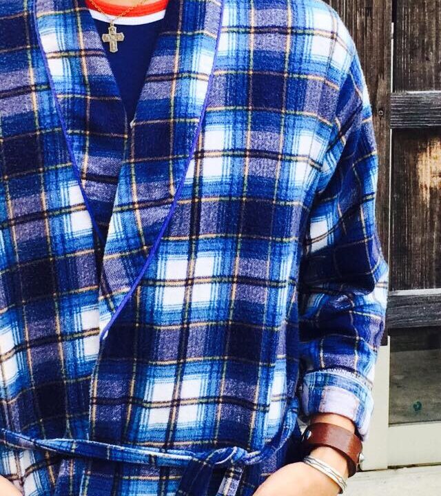 ショールカラー(へちま襟)からフロント、袖口にかけて施されたネイビーのパイピング。これが全体の印象をグッと引き締めています。「Royalty(王族)」という名の通り、室内着でありながら気品を感じさせる意匠です。
