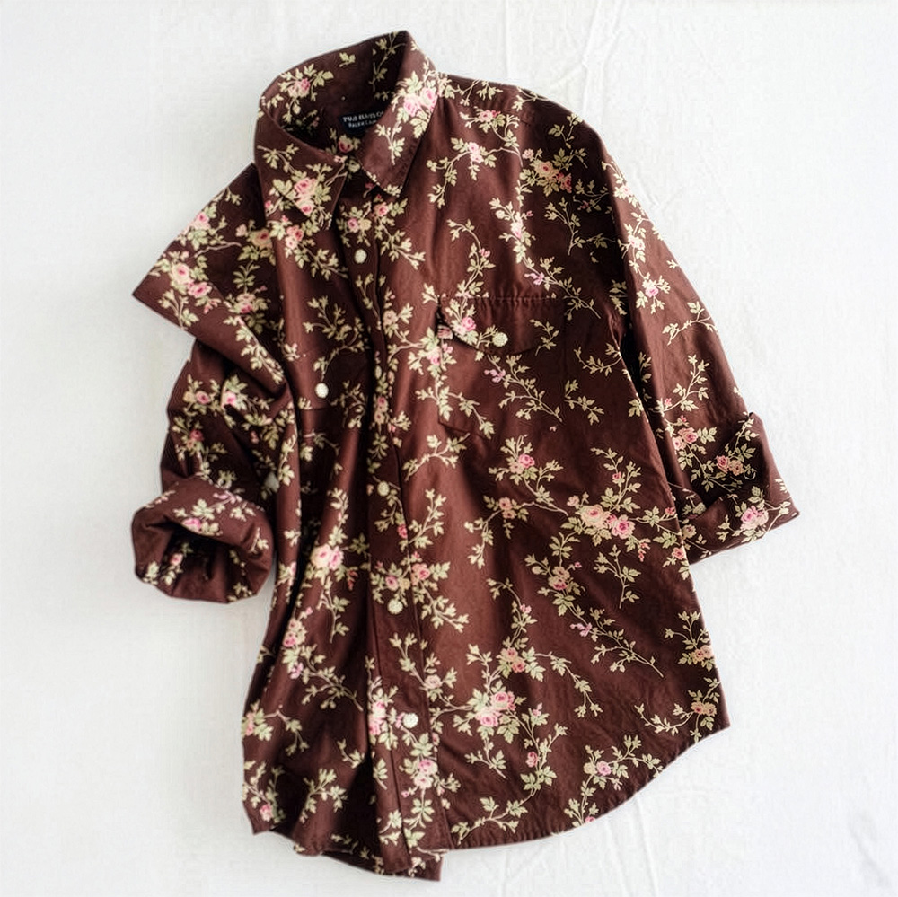 チョコレートブラウンの地に配された、繊細なバラのプリント。これはラルフ・ローレンが長年愛する「ブリティッシュ・カントリー」の美学と、90年代の「グランジ」的な色彩感覚が融合した名配色です。